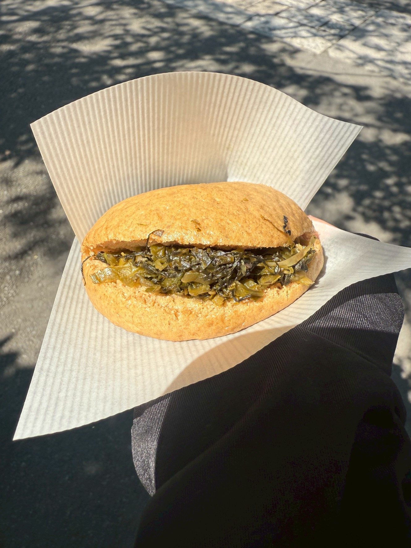 そば粉でできたパンに高菜がサンドされていて、塩分補給にもピッタリ。猛暑日でもしっかり熱中症対策ができました。